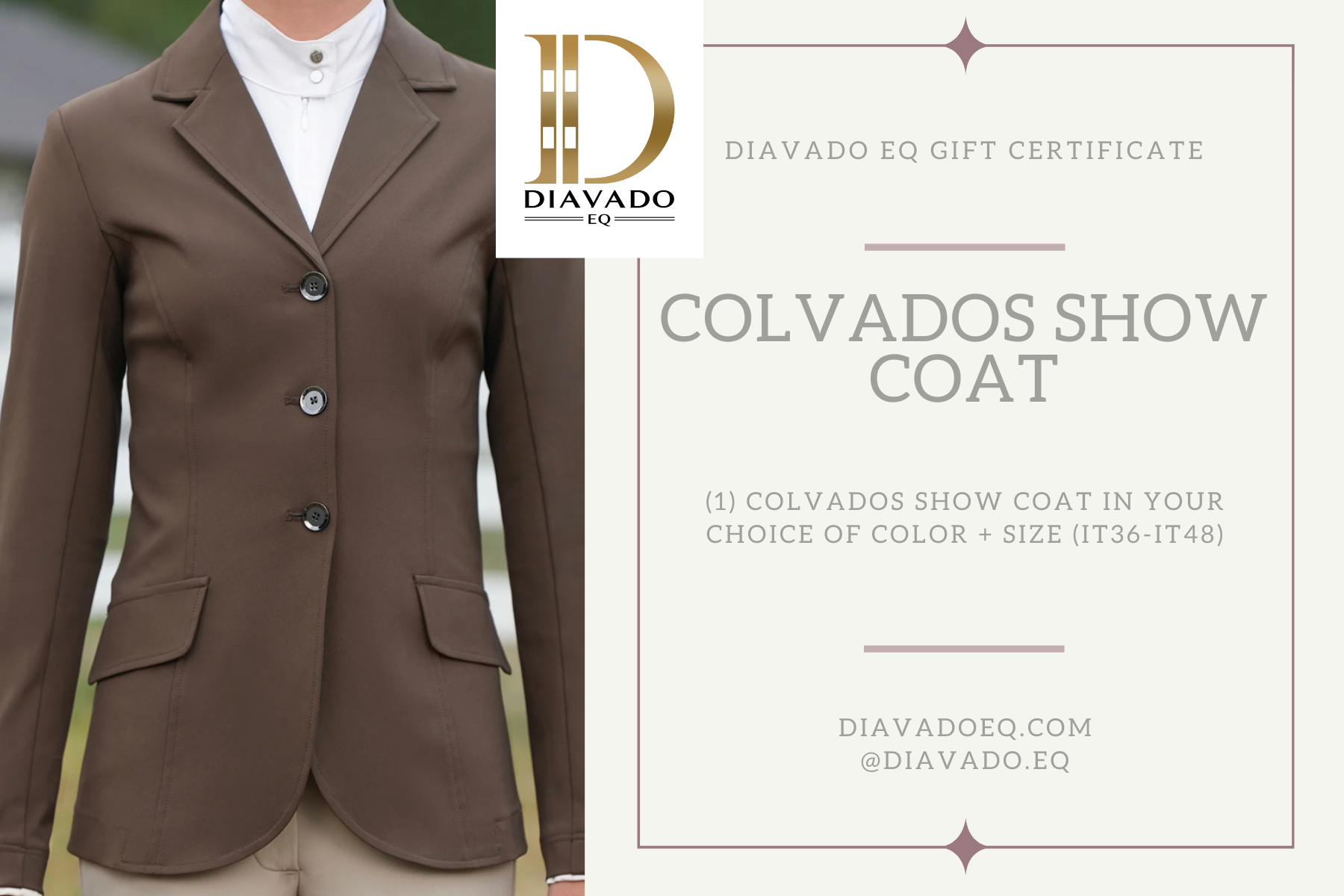 Valid for purchase of (1) Colvados Show Coat IT36-IT48 in your choice of in stock color. Not exchangeable for cash, non-refundable. Please contact Diavado Eq via email info@diavadoeq.com to make an eligible purchase with your certificate!